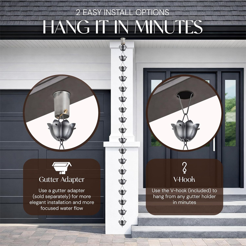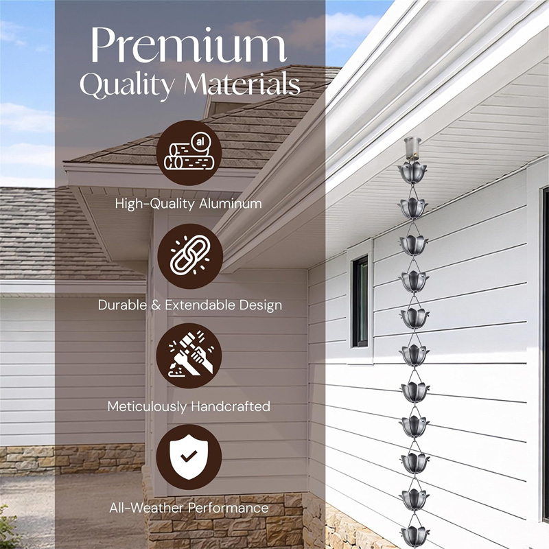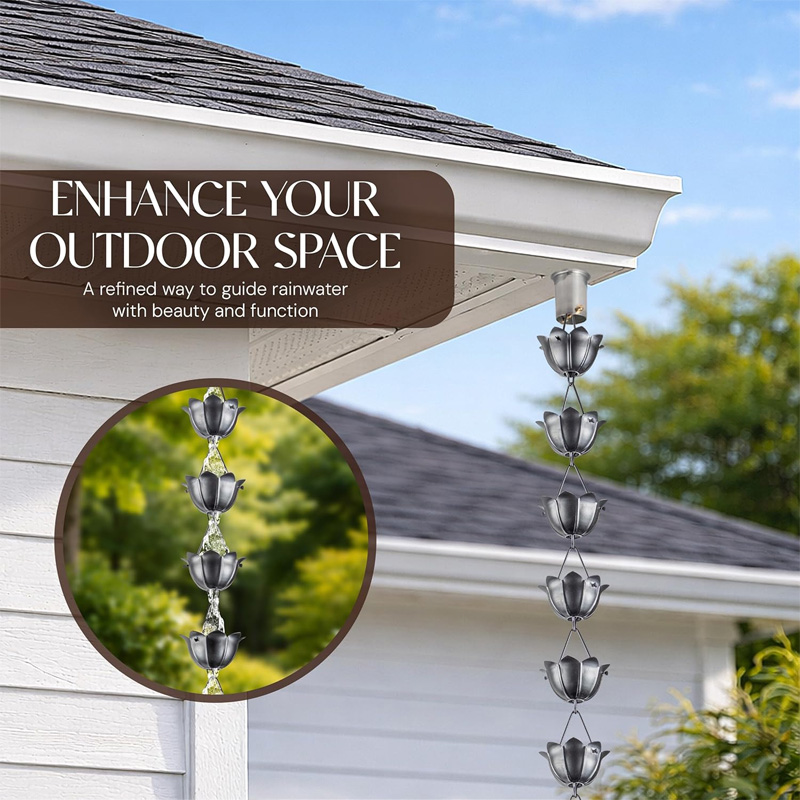 🏡 Patio and balcony decoration: Whether in a garden, balcony, or yard, the lotus rain chain perfectly decorates your outdoor space, adding a touch of romance and elegance to your home.