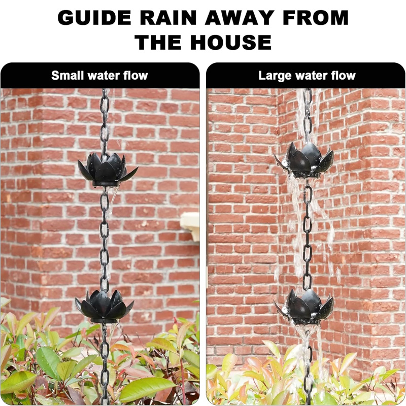 🌧️ Rainwater drainage: The lotus rain chain is not only a beautiful decoration, but its unique design effectively guides rainwater flow, preventing it from overflowing onto walls or the ground, and avoiding water accumulation that could damage your house and garden.